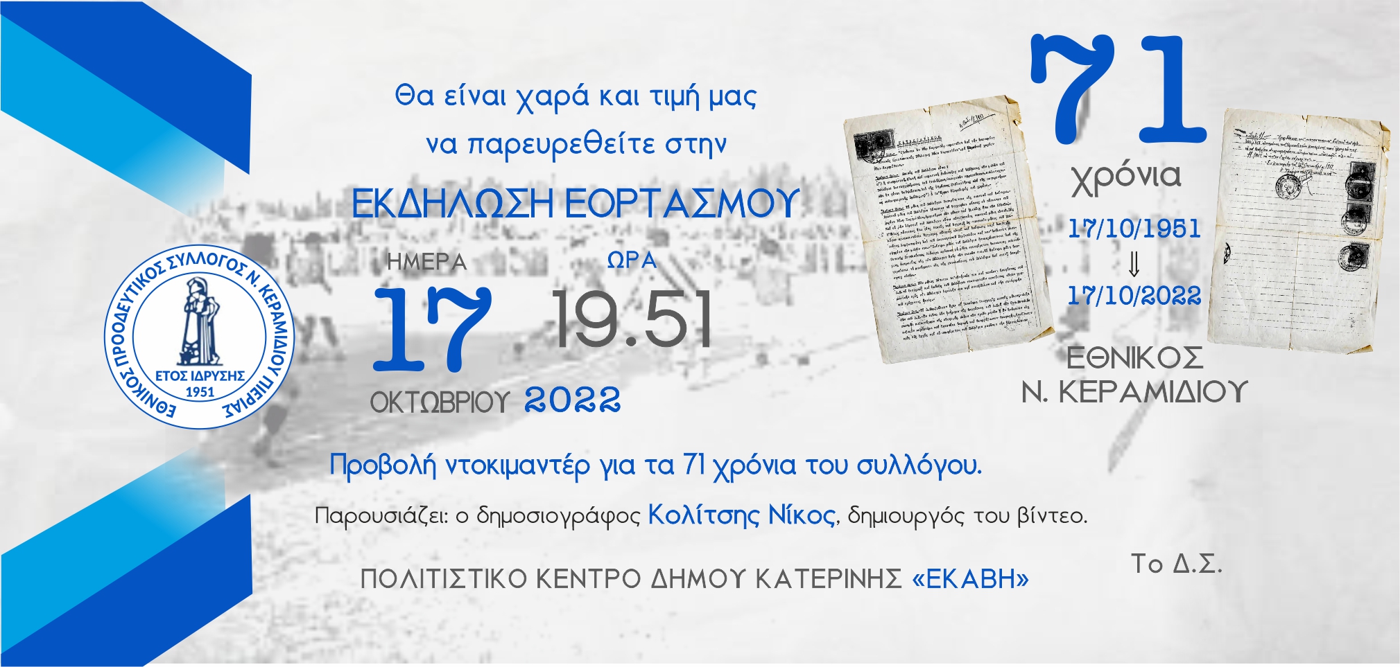 Εορταστική Εκδήλωση για τα 71 χρόνια από την ίδρυση του Συλλόγου (17/10/1951 – 17/10/2022) θα πραγματοποιηθεί στο Πνευματικό Κέντρο ΕΚΑΒΗ, στις 17 Οκτωβρίου και ώρα 19.51, κατά την οποία θα προβληθεί βίντεο με μια ιστορική αναφορά στα 71 χρόνια λειτουργίας του Συλλόγου.